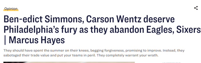 而根据费城当地记者马库斯·海斯撰写的文章,当地人对于西蒙斯的所作所为,也感到非常不满。海斯在文章中写道:“NBA中莱昂纳德、哈登、安东尼·戴维斯、保罗·乔治都有过与西蒙斯类似的经历,但与西蒙斯不同的是,这些球员要求交易的那个赛季,都表现得非常不错。而且这些球员总有一天会入选名人堂。