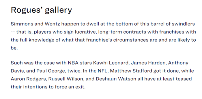 他们有相对合理的抱怨理由。而西蒙斯呢?他做了什么,又赢得了什么?他不能逃避责任,费城球迷更应该对此感到愤怒。费城为了让他感到开心,放弃了喜欢有球在手的全明星球员吉米·巴特勒,也从来没有去尝试获得一个强力控卫,以此来维护西蒙斯脆弱的心灵。