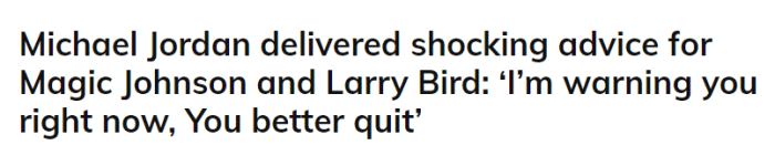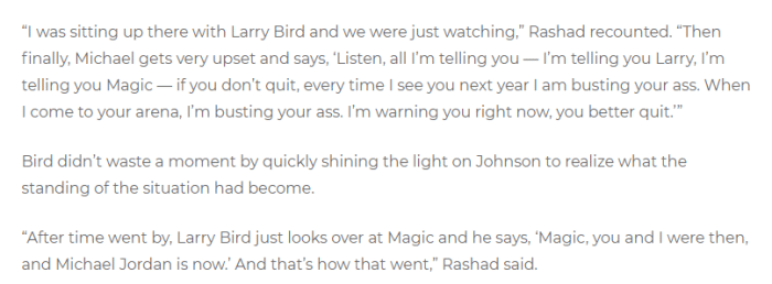 乔丹直接警告伯德和魔术师:如果你们还不从联盟退役,下个赛季的NBA只要我看见你们打一次,我就要打爆你们一次;然后伯德对魔术师说:你跟我的时代已经结束了,现在是乔丹的时代了