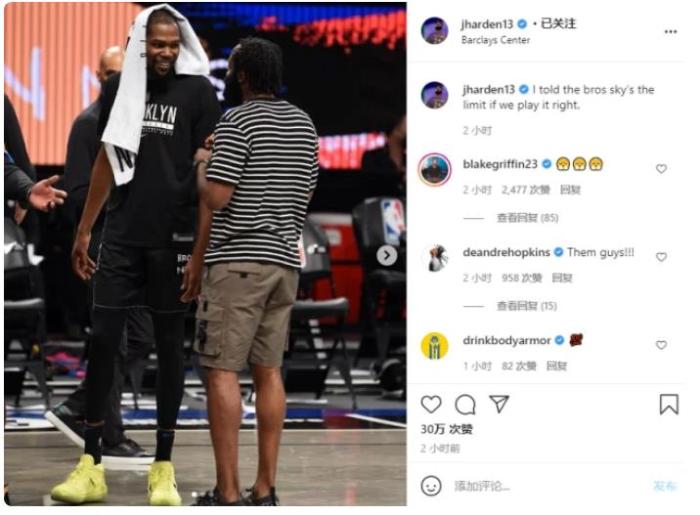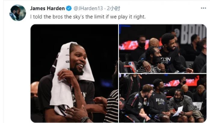 在篮网队获得胜利后,哈登晒出了三巨头的合影表表示:我告诉兄弟们,如果我们打得好的话,天空才是我们的极限。随后,哈登再次更新动态表示,杜兰特回来了,显然哈登想告诉联盟,我们已经准备好冲击冠军了,请拭目以待,最后,我们也期待篮网三巨头接下来的表现。