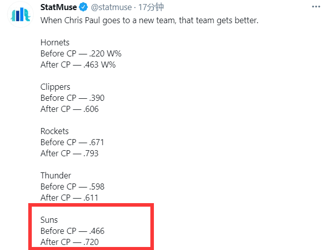 据美媒statmuse统计,保罗去到每支球队都会帮助球队提升胜率,到太阳尤其明显,胜率从去年的46.6%飞跃到了今年的72%!足足提升了25个百分点!保罗帮助太阳从一支长期无缘季后赛的球队直接变成了争冠热门之一!
