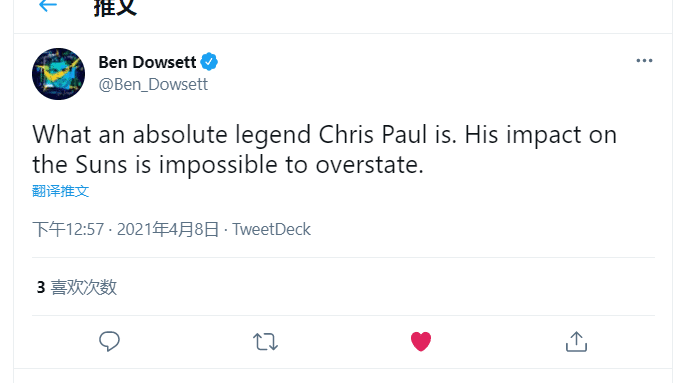 记者dowsett:克里斯保罗是绝对的传奇!他对太阳的影响力怎么夸大都不为过!