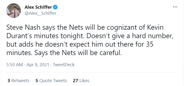 纳什在采访中透露了接下来对杜兰特的使用计划。纳什表示篮网会控制杜兰特这场比赛的上场时间,他没有给出确切的时间限制,但他补充道不会让杜兰特再打35分钟。篮网会非常谨慎。哈登复出后,预计篮网也会减少他的出场时间,确保这几位球星的健康。