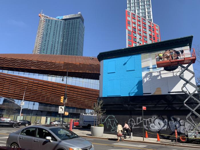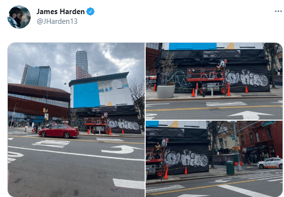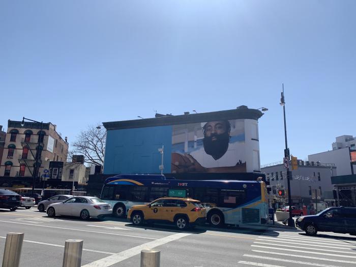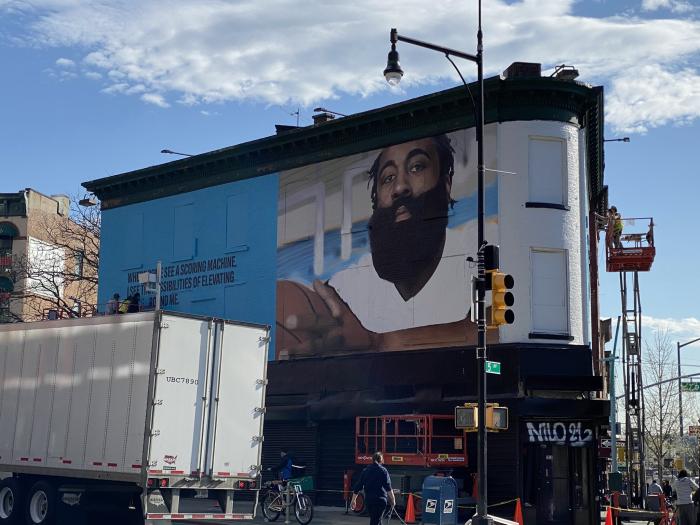 哈登巨幅壁画位于篮网主场巴克莱中心球馆对面的街道上,壁画中的哈登眼神专注,双手抱着篮球,大胡子最抢镜;壁画旁边写着哈登的提词:有些人看到了得分机器,但我看到了影响周边人的机会。