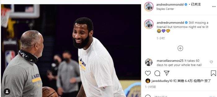 庄神复出倒计时,此前庄神在社交媒体上晒训练照,写道:仍然缺少一枚趾甲盖,但明晚我们斗志昂扬;庄神暗示对阵热火复出,杜德利点赞,浓眉在评论区留言:好的!