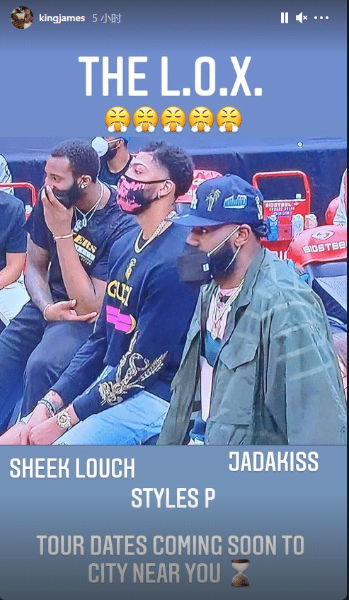来源:优直播04-08 15:58优直播4月8日讯湖人当家球星詹姆斯更新社交媒体,晒出三巨头的同框合影,暗示三人即将重返赛场;在InstagramStory晒照并且写道:L.O.X.说唱组合Sheen Louch、Styles P、Jadakiss(都是说唱歌手的名字),巡演日期临近,前往你周边的城市!