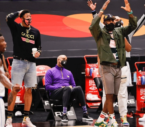 詹姆斯转发湖人三巨头坐在场边的同框画面——詹姆斯和浓眉都是穿着便装亮相,庄神则是身穿湖人训练短袖;詹姆斯把三巨头比作是说唱组合,暗示他们即将合体回归赛场。
