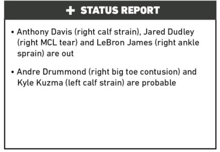 詹姆斯因脚踝扭伤连续缺席9场比赛,浓眉伤停更久,将近两个月缺席28场比赛,庄神则是伤停3场;湖人对阵热火伤病报告中,詹姆斯和浓眉继续缺阵,庄神被列为大概率出战,库兹马也是大概率出战。