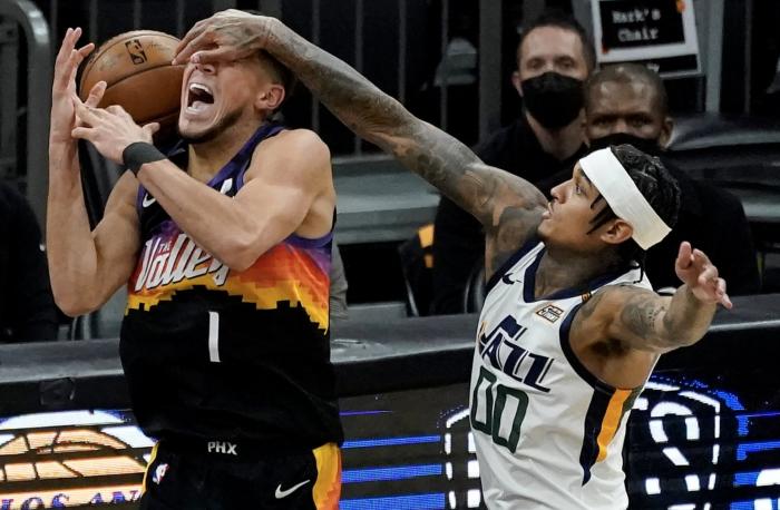 太阳最后一攻交给布克,布克单挑米切尔打铁不中,两队打进加时赛。