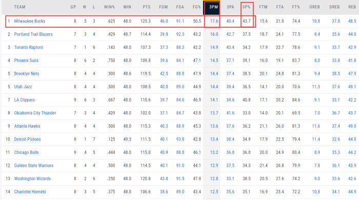 本赛季打到现在,雄鹿8场比赛场均可以投进夸张的17.6个三分,高居联盟第一,且他们的三分命中率也达到43.7%,同样排在联盟首位。