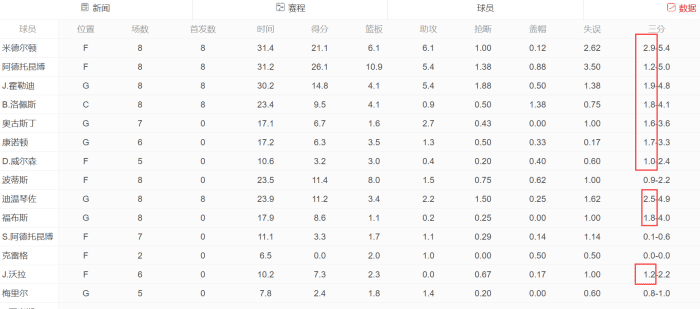 在今年休赛期,雄鹿引进了包括福布斯、波蒂斯、朱霍乐迪等多名具备不俗投射能力的新援,这让球队的三分能力大幅度提升!从图中可以看到,雄鹿目前有多达10名球员场均可以投进至少1记三分,其中米德尔顿场均2.9个最多,迪温琴佐2.5个排在第二!除此之外,波蒂斯场均也能投进0.9个,梅里尔场均0.8个!这支雄鹿几乎人人都能投三分,而且产量还不少!绝对可以说是全联盟三分火力最强的球队。