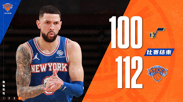 末节,佩顿和罗宾逊联手4分,尼克斯队以82-75领先。康利和克拉克森合取6分追近,罗宾逊空接扣篮,尼昂三分中的,爵士队追成84平。布洛克突然开火,连中2个三分球帮助尼克斯队再次领跑,克拉克森和奥尼尔分别投中三分,第四节还有5分10秒时爵士队追成96平。里弗斯挺身而出,投进3个三分球,一人连得11分帮助球队一下子拿到9分领先。米切尔跳投止血,里弗斯再中三分,兰德尔两罚全中,尼克斯队在第四节还有33.1秒时以112-100领先。英格尔斯和康利先后错失三分,爵士队落败。