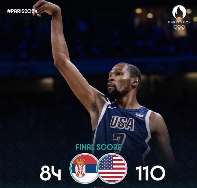 优直播 7月29日讯 奥运男篮小组赛C组,美国男篮对阵塞尔维亚。比赛开始,塞尔维亚率先发力打出10-2的开局,科尔叫停调整换下恩比德,美国男篮随即轰出12-2强势反超,杜兰特手感火热连续拿分,次节詹姆斯和杜兰特依旧弹无虚发,美国男篮多点开花取得两位数领先,约基奇带队努力追赶,杜兰特压哨帮助美国男篮58-49领先结束上半场。易边再战,塞尔维亚命中率下降,美国男篮攻防两端优势明显不断扩大分差,末节阿德巴约暴扣将分差拉开到20分以上,塞尔维亚苦苦追赶无果。最终,美国男篮110-84击败塞尔维亚。
