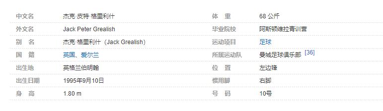杰克·格里利什(Jack Grealish),全名杰克·皮特·格里利什(Jack Peter Grealish),1995年9月10日出生于英格兰伯明翰,英格兰足球运动员,司职前腰,现效力于英格兰足球超级联赛的曼城足球俱乐部。个人简介: