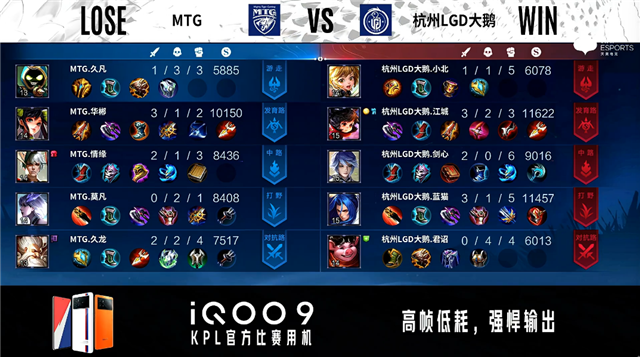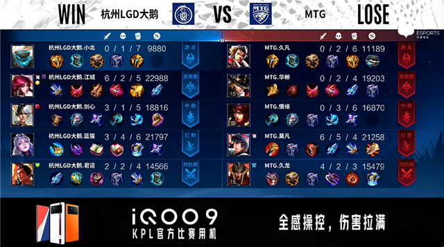 双方常规开局。2分10秒杭州LGD大鹅发育路击杀狄仁杰拿到一血。3分20秒MTG中路击杀沈梦溪。5分53秒对抗路团战MTG打出0换2。7分40秒MTG拿下暴君。10分45秒杭州LGD大鹅拿下暗影主宰。11分34秒MTG拿下暗影暴君。13分30秒MTG摧毁敌方中路外塔。14分34秒杭州LGD大鹅摧毁敌方对抗路二塔。14分38秒杭州LGD大鹅摧毁敌方发育路二塔。15分44秒发育路团战MTG打出1换3。16分13秒MTG发育路击杀沈梦溪。16分25秒MTG团灭对手摧毁水晶拿下比赛。