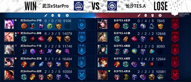 双方和平开局。1分32秒武汉eStarPro入侵野区,关羽拿下一血。2分13秒裴擒虎被击杀。2分30秒云缨拿下主宰。2分43秒武汉eStarPro入侵野区,双方1换1。3分13秒裴擒虎被击杀。3分20秒野区团战,东皇太一被击杀。4分钟云缨拿下暴君。4分50秒成吉思汗推掉下路一塔。5分30秒上路团战,武汉eStarPro打出1换2。6分钟成吉思汗推掉上路二塔。6分40秒野区团战,武汉eStarPro打出0换2。7分钟云缨拿下主宰。8分19秒成吉思汗推掉中路一塔。8分34秒成吉思汗推掉下路高地塔。9分10秒野区团战,武汉eStarPro打出1换3。10分20秒野区团战,武汉eStarPro打出0换2。10分35秒云缨拿下主宰。12分钟云缨拿下暴君。12分21秒裴擒虎被击杀。13分钟高地团,武汉eStarPro团灭长沙TES.A。13分10秒武汉eStarPro推掉水晶拿下本场比赛胜利。