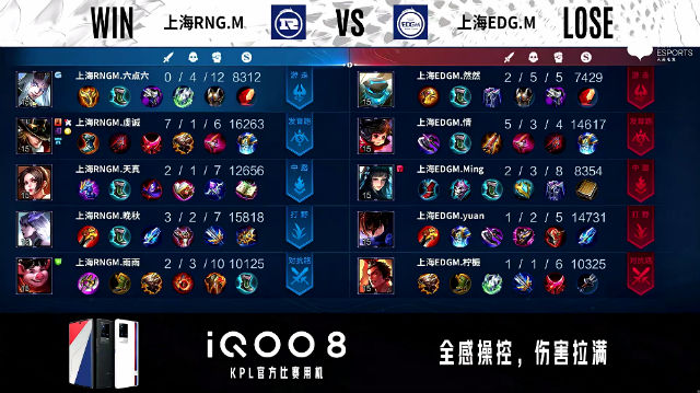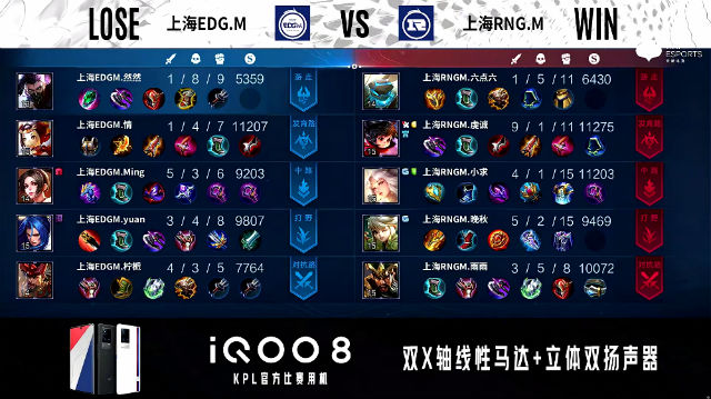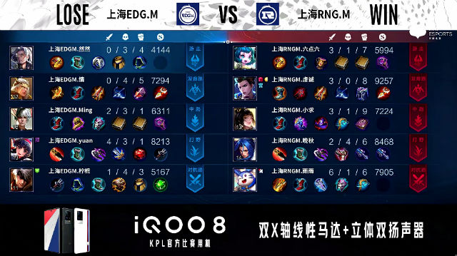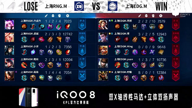52秒,上海EDG.M廉颇上路击杀关羽拿下一血。1分08秒,中路团,上海EDG.M打出1换2,随后反掉上海RNG.M蓝buff。1分51秒,上海RNG.M下路击杀鲁班七号。2分41秒,双方团,上海RNG.M打出0换2。2分45秒,上海EDG.M控下先知主宰。4分27秒,双方中路1换1。4分40秒,上海EDG.M鲁班七号强推掉上海RNG.M下一塔。5分15秒,上海RNG.M破掉上海EDG.M下一塔。5分45秒,上海RNG.M控下暴君。6分10秒,中路团,双方2换2。7分21秒,上海RNG.M控下先知主宰。7分47秒,上海RNG.M破掉上海EDG.M中一塔。8分30秒,上路团,上海RNG.M打出1换3并破掉上海EDG.M上二塔。8分58秒,上海EDG.M破掉上海RNG.M中二塔。9分46秒,上海RNG.M团战打出1换2。10分14秒,上海RNG.M控下暗影暴君。11分48秒,上海RNG.M破掉上海EDG.M中高地,随后团战双方3换3。13分28秒,上海RNG.M控下暗影主宰。14分39秒,上海RNG.M控下暗影暴君,随后团战上海RNG.M打出2换4。15分16秒,上海RNG.M击杀敌方最后一人后一波摧毁上海EDG.M水晶赢下比赛。