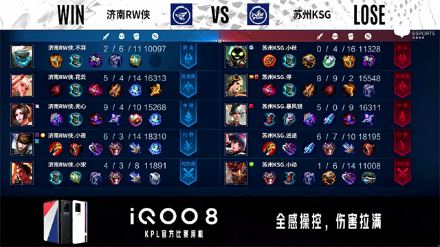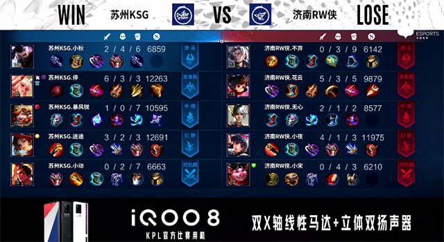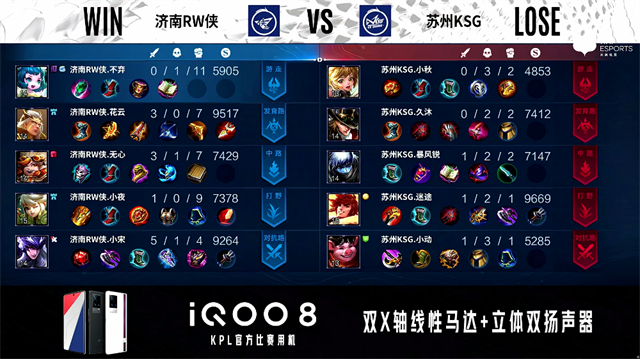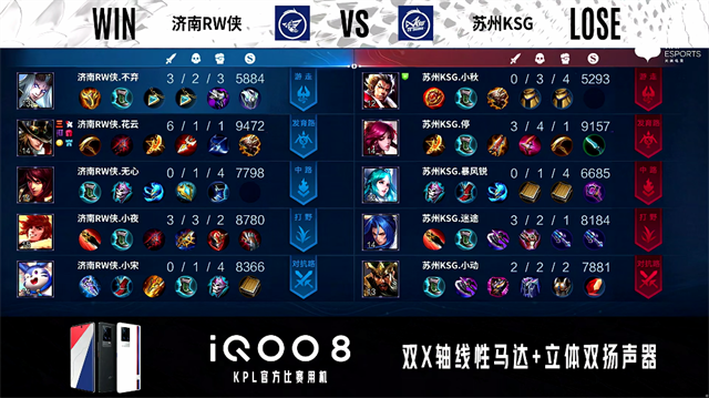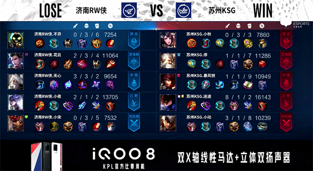 1分22秒,济南RW侠公孙离下路单杀虞姬拿下一血。2分16秒,济南RW侠控下暴君,随后下路再次击杀虞姬。3分23秒,济南RW侠击杀太乙真人。4分10秒,苏州KSG控下先知主宰,随后团战双方1换1。4分42秒,下路团,济南RW侠盾山击杀虞姬。5分04秒,苏州KSG中路击杀赵云。6分16秒,双方团战1换1,济南RW侠破掉苏州KSG上一塔。7分06秒,济南RW侠不知火舞秒掉娜可露露。7分50秒,济南RW侠破掉苏州KSG中一塔并打出1换3,赵云拿下双杀。8分05秒,济南RW侠破掉苏州KSG下高地。9分48秒,济南RW侠破掉苏州KSG上二塔。10分12秒,济南RW侠拿下暗影暴君,随后再控下暗影主宰。11分18秒,济南RW侠破掉苏州KSG中二塔。11分56秒,苏州KSG反打打出1换2。12分50秒,双方团,苏州KSG打出2换4,虞姬拿下四杀。15分05秒,济南RW侠破掉苏州KSG中高地,随后团,苏州KSG打出3换5团灭对手。18分14秒, 苏州KSG破掉济南RW侠中二塔。19分27秒,苏州KSG拿下暗影暴君。20分39秒,双方团,济南RW侠打出1换3。20分17秒,苏州KSG娜可露露打出1换2。22分40秒,苏州KSG先击杀不知火舞,随后团战济南RW侠打出0换2。23分33秒,济南RW侠控下风暴龙王。24分14秒,济南RW侠破掉苏州KSG上高地。24分28秒,济南RW侠边团边拆摧毁苏州KSG水晶扳回一城。