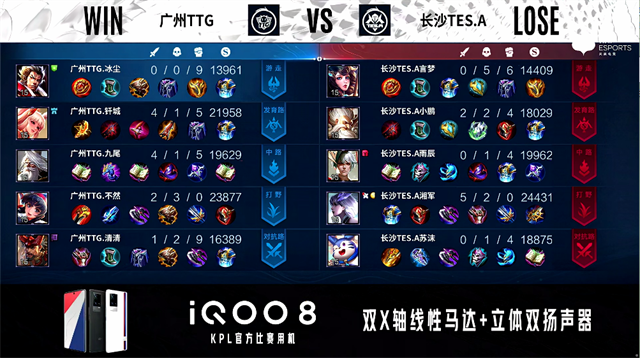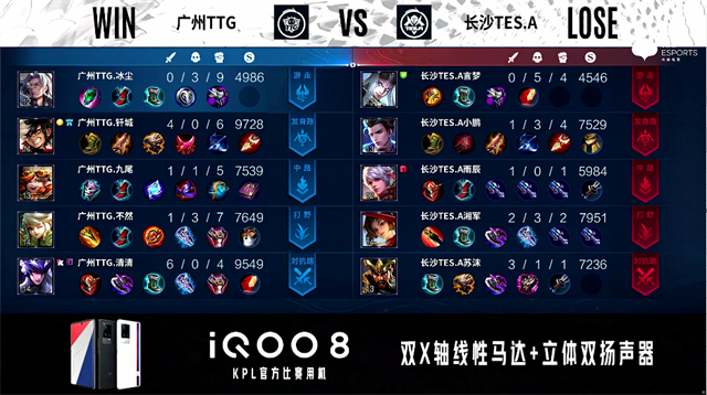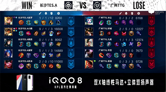 1分21秒,广州TTG镜下路击杀瑶拿下一血。2分57秒,广州TTG控下暴君。4分19秒,长沙TES.A拿下先知主宰。5分46秒,下路团,广州TTG反打打出0换2。6分10秒,长沙TES.A不知火舞击杀西施。10分19秒,长沙TES.A拿下暗影主宰。10分56秒,长沙TES.A破掉广州TTG中一塔。11分28秒,长沙TES.A破掉广州TTG上二塔。12分05秒,长沙TES.A拿下暗影暴君。12分57秒,下路团,长沙TES.A越塔打出1换3。13分21秒,长沙TES.A破掉广州TTG上高地。13分52秒,广州TTG镜中路拿下双杀。14分20秒,广州TTG破掉长沙TES.A中一塔,随后控下暗影主宰。15分40秒,双方团,广州TTG打出1换2,随后破掉长沙TES.A中二塔。16分01秒,双方团,广州TTG击杀兰陵王。16分56秒,广州TTG拿下暗影主宰。20分25秒,河道团,长沙TES.A打出1换2。22分06秒,双方团,广州TTG打出0换2。22分44秒,广州TTG先后破掉长沙TES.A中、上高地。23分22秒,广州TTG团灭对手,一波摧毁长沙TES.A水晶赢下比赛。