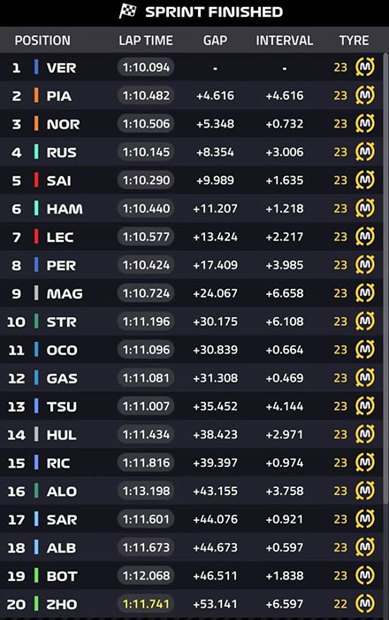 优直播讯 北京时间06月29日,F1奥地利站冲刺赛结束争夺,维斯塔潘夺冠,迈凯伦包揽2、3名,周冠宇垫底。