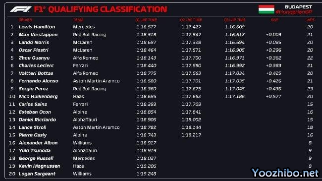 优直播讯 北京时间07月22日,2023年F1匈牙利大奖赛排位赛在布达佩斯赛道结束,梅赛德斯车队汉密尔顿在Q3最后一圈0.003秒的优势绝杀红牛车队维斯塔潘,取得本赛季个人首个杆位!这也是他第104个杆位,再一次刷新F1历史杆位数纪录;维斯塔潘第二,迈凯伦车队诺里斯第三,他的队友皮亚斯特里第四。