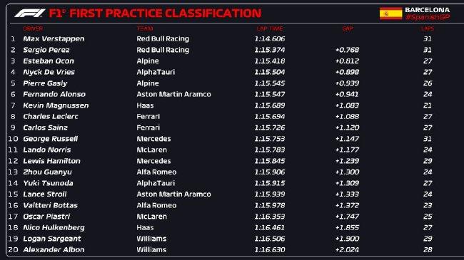 优直播讯 2023年F1西班牙大奖赛第1次练习赛在巴塞罗那赛道结束,红牛车队维斯塔潘以1:14.606排名第一,他的队友佩雷兹落后0.768秒排名第二,Alpine车队奥康落后0.812秒排名第三。德弗里斯、加斯利、阿隆索,马格努森,勒克莱尔,塞恩斯,拉塞尔分列四至十位。中国车手周冠宇圈速第13位。