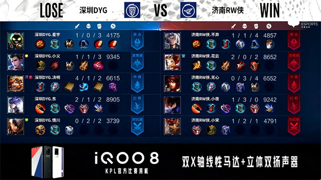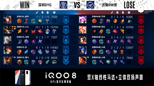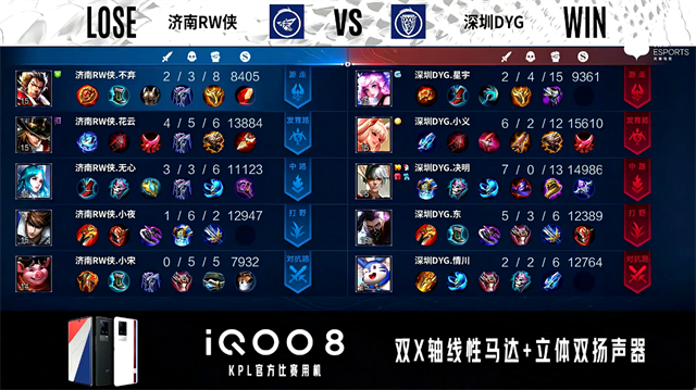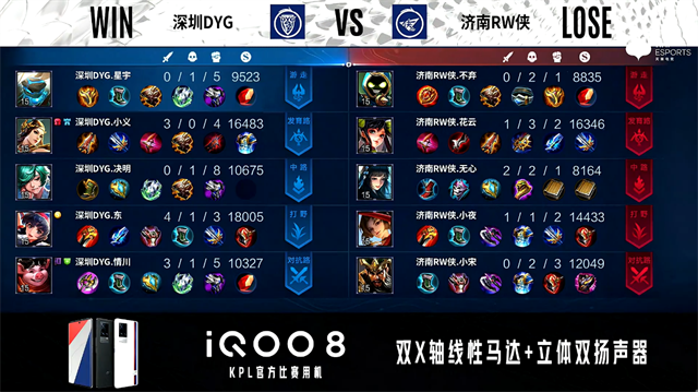 双方常规开局。2分32秒深圳DYG中路击杀不知火舞拿到一血。3分52秒济南RW侠发育路击杀大乔。7分25秒济南RW侠拿下暴君。7分42秒深圳DYG对抗路击杀公孙离。7分59秒深圳DYG摧毁敌方对抗路外塔。8分48秒济南RW侠野区击杀云缨。9分36秒济南RW侠拿下主宰。10分30秒深圳DYG野区击杀吕布。10分52秒济南RW侠拿下暗影暴君。11分32秒济南RW侠野区击杀马可波罗。12分09秒双方发育路2换2,济南RW侠摧毁敌方发育路高地塔。13分06秒对抗路团战深圳DYG打出0换3。15分05秒双方中路1换1。15分36秒深圳DYG暴君处打出0换2。16分42秒中路团战深圳DYG打出0换4。17分16秒深圳DYG摧毁敌方水晶拿下比赛。