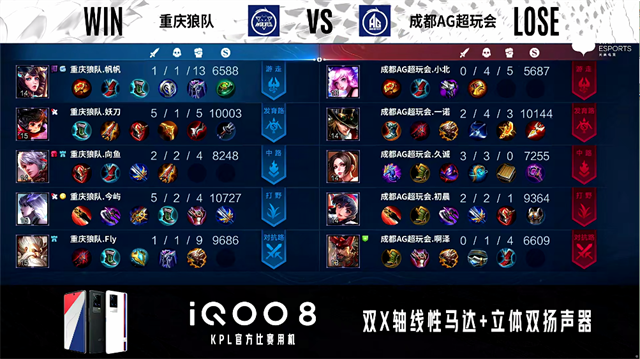2分24秒,成都AG控下先知主宰。5分22秒,野区团,双方1换1。6分05秒,成都AG破掉重庆狼队上一塔。6分37秒,中路团,重庆狼队打出0换3,随后控下暴君。7分10秒,重庆狼队破掉成都AG中一塔。7分20秒,重庆狼队击杀白起。8分55秒,下路团,重庆狼队打出0换2并破掉成都AG下二塔。9分26秒,重庆狼队破掉成都AG中二塔。10分21秒,重庆狼队控下暗影暴君。12分09秒,重庆狼队控下暗影主宰。13分36秒,成都AG反打打出0换2。14分42秒,重庆狼队控下暗影暴君。15分50秒,重庆狼队破掉成都AG下高地,成都AG击杀脱节的廉颇。16分42秒,双方团,重庆狼队打出0换2。17分15秒,重庆狼队破掉成都AG中、上高地。17分47秒,重庆狼队控下暗影主宰。19分07秒,重庆狼队公孙离拿下三杀后破掉成都AG水晶先下一城。