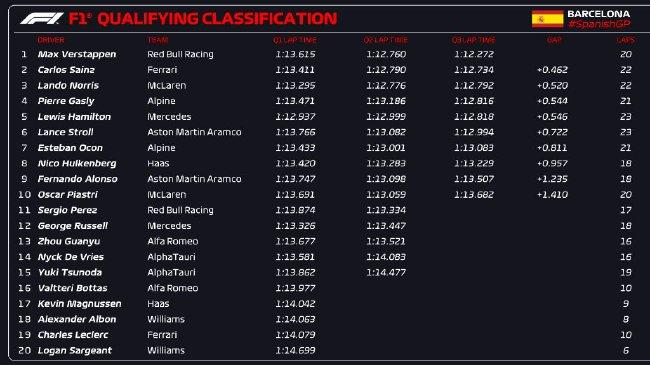 优直播讯 2023年F1西班牙大奖赛排位赛在巴塞罗那赛道结束。红牛车队维斯塔潘凭借Q3第一个飞驰圈的表现,以0.462秒的优势毫无悬念地拿到赛季第4个杆位,法拉利车队塞恩斯第二,迈凯伦车队诺里斯第三!