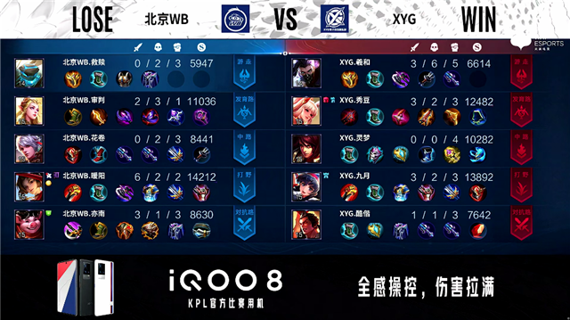 2分19秒,北京WB控下暴君,随后团战双方1换1。3分41秒,北京WB娜可露露入侵野区配合西施击杀不知火舞。6分20秒,XYG破掉北京WB上一塔。7分40秒,XYG不知火舞中路击杀娜可露露。8分20秒,XYG控下先知主宰,随后击杀吕布。8分51秒,XYG破掉北京WB上二塔。10分25秒,双方团,北京WB打出1换2。10分51秒,XYG狄仁杰拿下双杀,随后控下暗影暴君。11分38秒,XYG打出1换2并破掉北京WB中一塔。12分16秒,XYG破掉北京WB下二塔。14分45秒,上路团,北京WB打出0换3,随后破掉XYG下二塔。15分24秒,北京WB破掉XYG下高地,随后团战双方4换4。17分23秒,北京WB控下暗影暴君并击杀廉颇。20分28秒,XYG强冲击杀公孙离。21分02秒,XYG拿下风暴龙王。22分10秒,XYG破掉北京WB中二塔。22分28秒,XYG破掉北京WB下高地。23分钟,XYG破掉北京WB上高地。23分29秒,双方团,XYG打出2换5团灭对手,随后摧毁北京WB水晶先下一城。