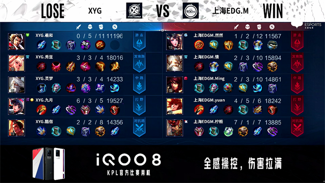 开局上海EDG.M关羽抢到云缨蓝buff。1分51秒,上海EDG.M娜可露露上路击杀云缨拿下一血。2分08秒,上海EDG.M控下先知主宰。2分30秒,下路团,双方1换1。2分58秒,上海EDG.M西施下路击杀鲁班七号。4分10秒,上海EDG.M控下暴君。4分34秒,双方团战2换2。7分13秒,上海EDG.M盾山越塔开团助队伍打出1换3,随后队伍破掉XYG中路两座外塔及上二塔。8分48秒,上海EDG.M破掉XYG下二塔。10分16秒,上海EDG.M控下暗影主宰及暗影暴君。12分01秒,中路团,上海EDG.M打出0换2,随后破掉XYG中高地。12分40秒,上海EDG.M一波摧毁XYG水晶拿到赛点。