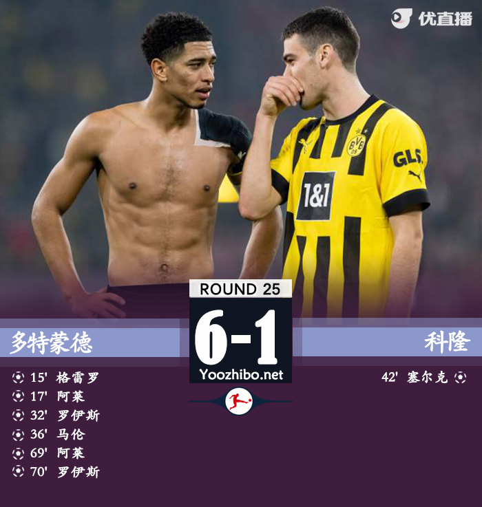 优直播讯 北京时间3月19日凌晨1点30分,2022-23赛季德甲第25轮在伊杜纳信号公园球场展开角逐,多特蒙德坐镇主场迎战科隆。上半场格雷罗两传一射,马伦传射,阿莱和罗伊斯破门,塞尔克扳回一城,下半场阿莱和罗伊斯均梅开二度。最终多特蒙德主场6-1大胜科隆,积分榜方面,多特积53分先赛一轮升至榜首。