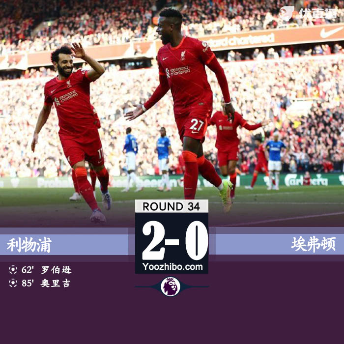 优直播4月25日讯 北京时间4月24日23时30分,2021-2022赛季英超第34轮上演一场默西塞德德比战,利物浦主场迎战埃弗顿。上半场双方均无建树,利物浦半场0-0战平埃弗顿。下半场,萨拉赫助攻罗伯逊首开纪录,替补登场的奥里吉破门锁定胜局。最终利物浦主场2-0击败埃弗顿,取得联赛两连胜。此役战罢,利物浦继续排名第二,依旧落后领头羊曼城1分。