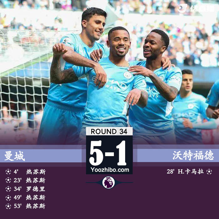 优直播4月23日讯 北京时间4月23日22:00,英超联赛第34轮,曼城主场迎战沃特福德。上半场比赛,热苏斯头顶脚踢梅开二度,卡马拉低射远角扳回一城,罗德里世界波破门。下半场比赛,热苏斯造点并亲自主罚命中,随后接到德布劳内横传推射入网完成大四喜。最终全场比赛结束,曼城5-1战胜沃特福德,继续排名积分榜首位。