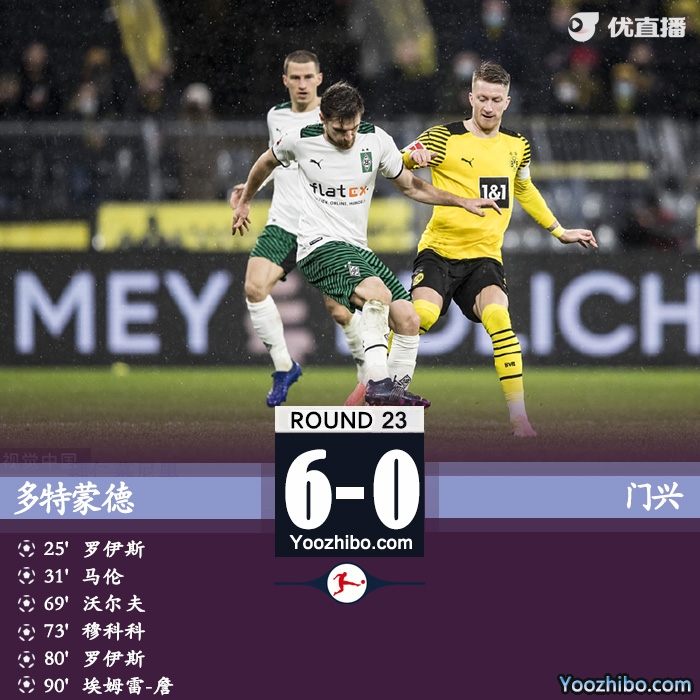 优直播 2月21日讯 北京时间2月21日0点30分,德甲第23轮,多特蒙德主场对阵门兴。上半场,罗伊斯传射,马伦破门,科贝尔多次贡献扑救,雷纳伤退。下半场,霍夫曼射中门框,罗伊斯助攻沃尔夫和穆科科替补破门后自己再度打入一球,沃尔夫造点,埃姆雷詹点射破门。全场比赛结束,多特蒙德6-0大胜门兴。