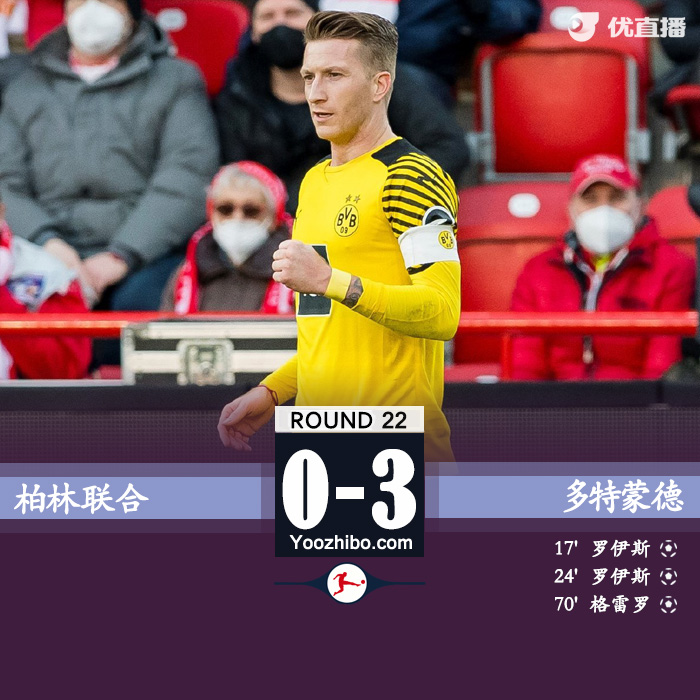 优直播2月13日讯 北京时间2月13日22:30,德甲联赛第22轮柏林联合主场迎战多特的比赛。上半场罗伊斯禁区低射建功,随后过掉门将破门梅开二度,半场多特客场2-0柏林联。下半场格雷罗补射建功,最终多特客场3比0大胜柏林联。
