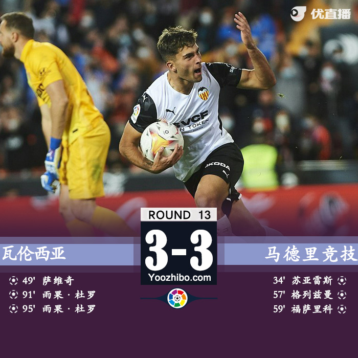 优直播讯11月8日讯 北京时间11月7日23点15分,西甲第13轮,马德里竞技客场挑战瓦伦西亚。上半场,特里皮尔伤退,苏亚雷斯破门。下半场,萨维奇不慎自摆乌龙,格列兹曼和福萨里科3分钟内连入两球,瓦斯射中门框,雨果杜罗替补登场在补时阶段连追两球完成绝平,全场比赛结束,马德里竞技3-3瓦伦西亚。