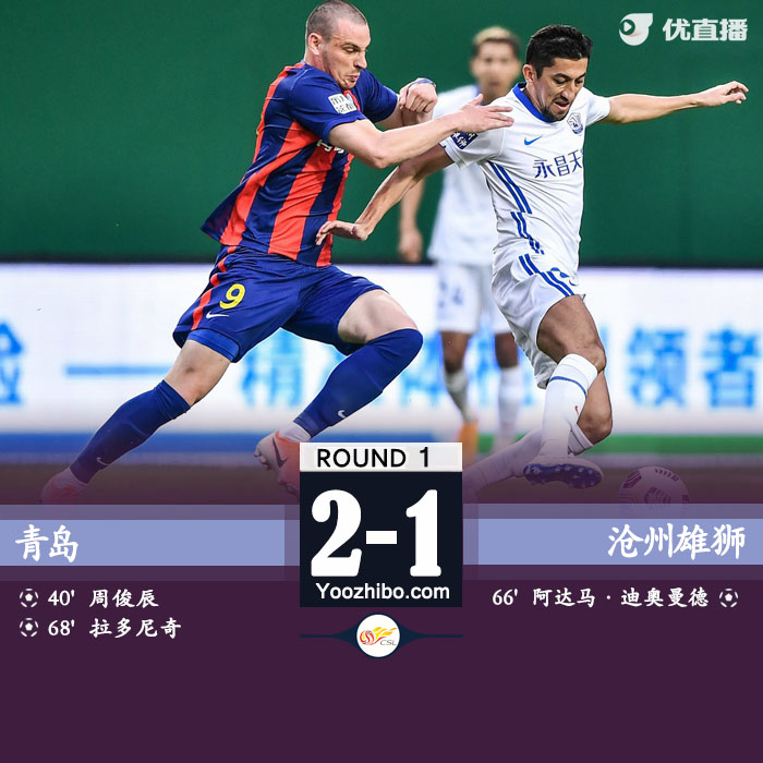 优直播4月21日讯 北京时间4月21日18:00,中超联赛第一阶段第1轮,青岛对阵沧州雄狮。上半场,周俊辰抽射破门,穆里奇包抄打飞失良机。下半场,迪奥曼德扳平比分,拉多尼奇世界波破门再次超出,此后双方未能改写比分。全场比赛结束,青岛2-1战胜沧州,取得新赛季开门红。