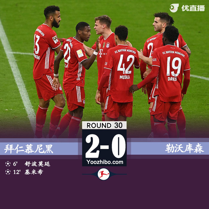 优直播4月21日讯 北京时间4月21日凌晨2时30分,2020-2021赛季德国甲级联赛第30轮上演一场焦点战役,拜仁慕尼黑坐镇安联球场迎战勒沃库森。上半场,舒波-莫廷破门首开纪录,基米希扩大领先优势。拜仁半场2-0领先勒沃库森。下半场,舒波-莫廷打进一球,但是被判罚越位在先,随后替补上场的贝拉拉比有一次射门击中横梁。最终拜仁慕尼黑主场2-0击败勒沃库森。本轮战罢,拜仁继续排名榜首,领先第二名10分,本赛季德甲还剩下4轮。