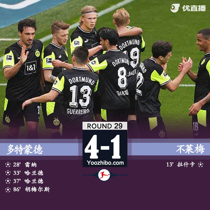 优直播4月18日讯 北京时间4月18日晚上21:30,2020-21赛季德甲第29轮,多特蒙德坐镇主场迎战不莱梅。上半场,拉希察单刀破门,雷纳爆射扳平比分,罗伊斯造点哈兰德主罚命中,哈兰德推空门得手。半场战罢,多特蒙德暂3-1不莱梅。下半场,罗伊斯屡造险,埃格斯泰因中柱,哈兰德头球破门越位,塞拉西乌龙。全场比赛结束,多特蒙德4-1不莱梅,本赛季双杀对手的同时,距欧冠区4分。