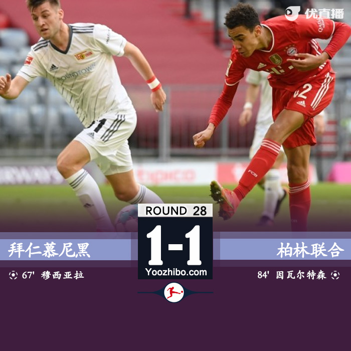 优直播4月10日讯 北京时间4月10日21:30,德甲联赛第28轮,拜仁慕尼黑主场迎战柏林联合。上半场比赛,穆西亚拉弧顶低射打偏,布特勒禁区内头球被诺伊尔没收。下半场比赛,穆西亚拉接到穆勒横传门前晃过后卫推射破门,因瓦尔特森抢点扳平比分。最终全场比赛结束,拜仁慕尼黑主场1-1与柏林联战平,由于另一场比赛莱比锡获胜,拜仁以5分优势暂时领跑积分榜。