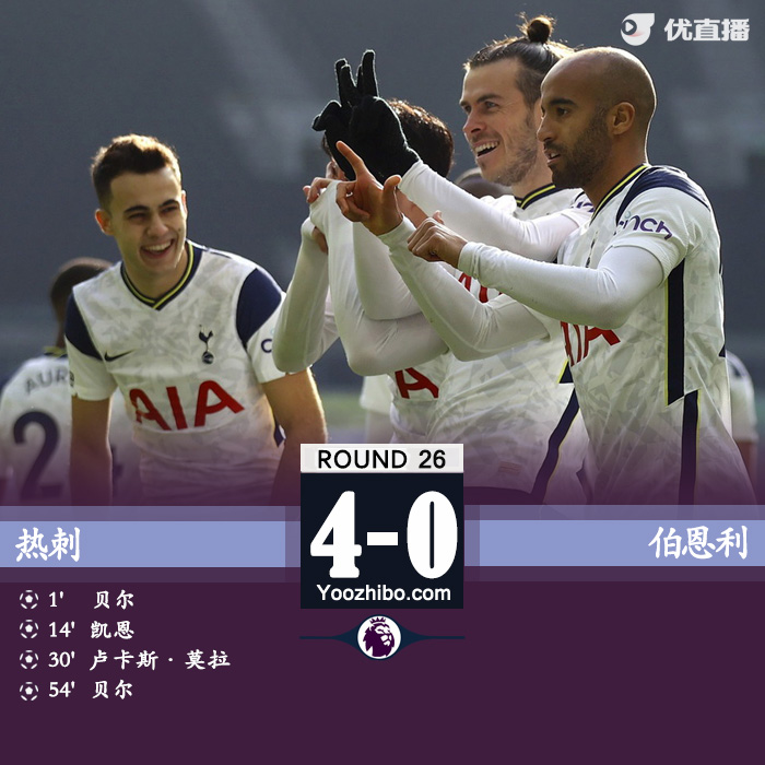 优直播讯 北京时间2月28日22:00,英超第26轮继续进行,热刺坐镇主场迎战伯恩利。上半场开场68秒,贝尔接孙兴慜助攻打进闪电进球帮热刺取得领先,此球为英超球队对阵伯恩利的最快进球,随后贝尔又送出长传助攻凯恩扩大比分,雷吉隆助攻小卢卡斯再入一球。下半场,贝尔再次接孙兴慜助攻完成双响。最终,热刺4-0大胜伯恩利,结束两连败。