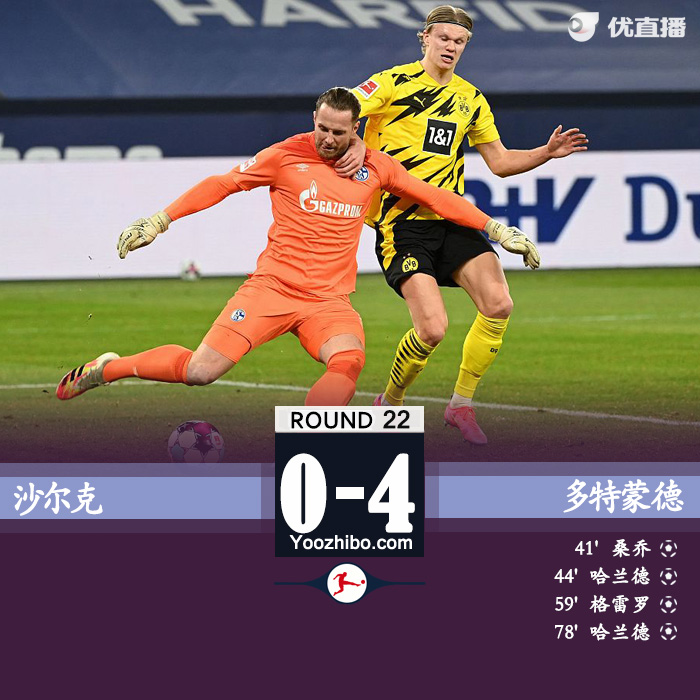 优直播2月21日讯 北京时间2月21日01:30,德甲第22轮鲁尔区德比展开争夺,多特蒙德客场挑战沙尔克。上半场,桑乔利用对方后场失误劲射先下一城,随后助攻哈兰德侧钩扩大比分。下半场,罗伊斯助攻格雷罗推射破门,贝林厄姆助攻哈兰德完成梅开二度。最终,多特蒙德4-0客场大胜沙尔克全取3分,仍居第6位。