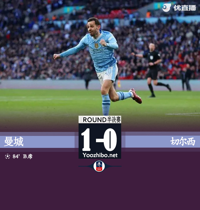 优直播讯:北京时间4月21日00:15,足总杯半决赛在温布利大球场展开角逐,曼城对阵切尔西,本场主裁判为迈克尔-奥利弗。上半场,雅克松单刀过门将后不打门选择回传被破坏,曼城零射正。下半场,格拉利什禁区内手球未判,伯纳多-席尔瓦补射绝杀。最终,曼城1-0力克切尔西,晋级足总杯决赛。