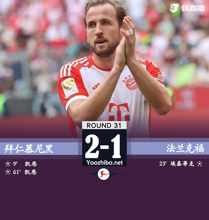 优直播讯:北京时间4月27日21:30,德甲第31轮,拜仁主场迎战法兰克福。上半场,莱默尔一条龙送出助攻后伤退,凯恩破门,埃基蒂克远射扳平;下半场,穆勒造点,凯恩点射梅开二度。最终,拜仁2-1击败法兰克福,积69分继续位列积分榜第二位,球队下周中将迎来与皇马的欧冠半决赛首回合赛事,法兰克福积45分排在积分榜第6位。由于多特本轮输球,拜仁领先多特已达12分,锁定下赛季欧冠资格。
