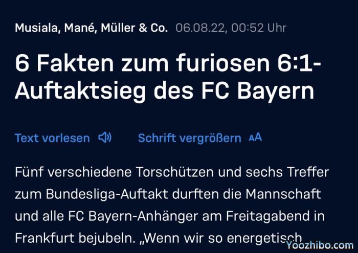 优直播08月06日讯 今日,拜仁在德甲首轮作客6-1大胜法兰克福,拜仁官网也统计了多项相关数据: