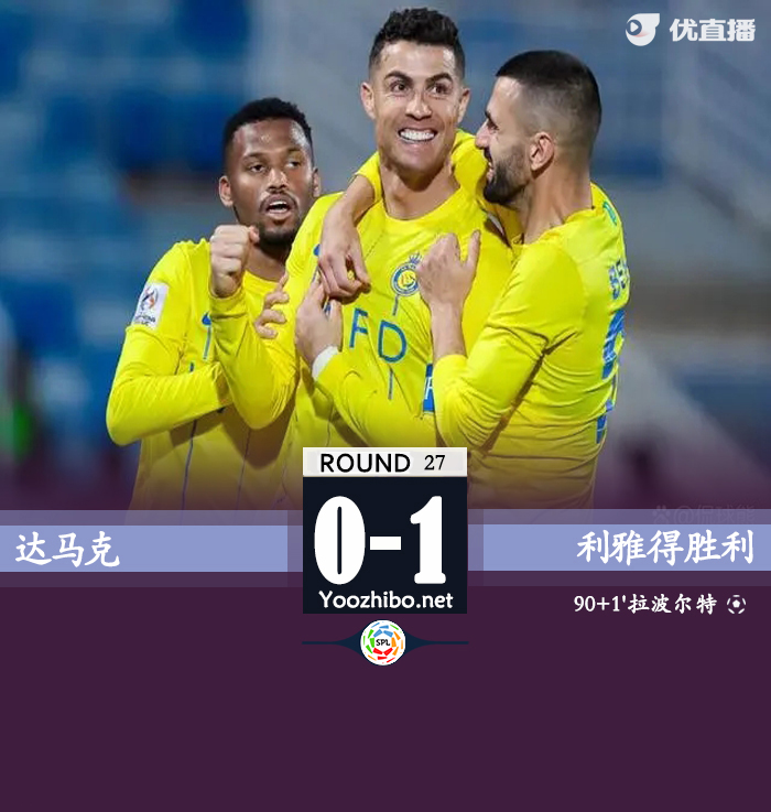 优直播讯:4月6日,沙特联赛第27轮,达马克主场迎战利雅得胜利。上半场,两队均无建树。下半场,C罗替补出场,葡萄牙球星送出妙传,加里卜射门击中横梁弹出。随后,C罗的射门被后卫门线解围。补时阶段,布罗佐维奇开出角球,拉波尔特头槌上演绝杀。全场比赛结束,利雅得胜利1-0击败达马克。
