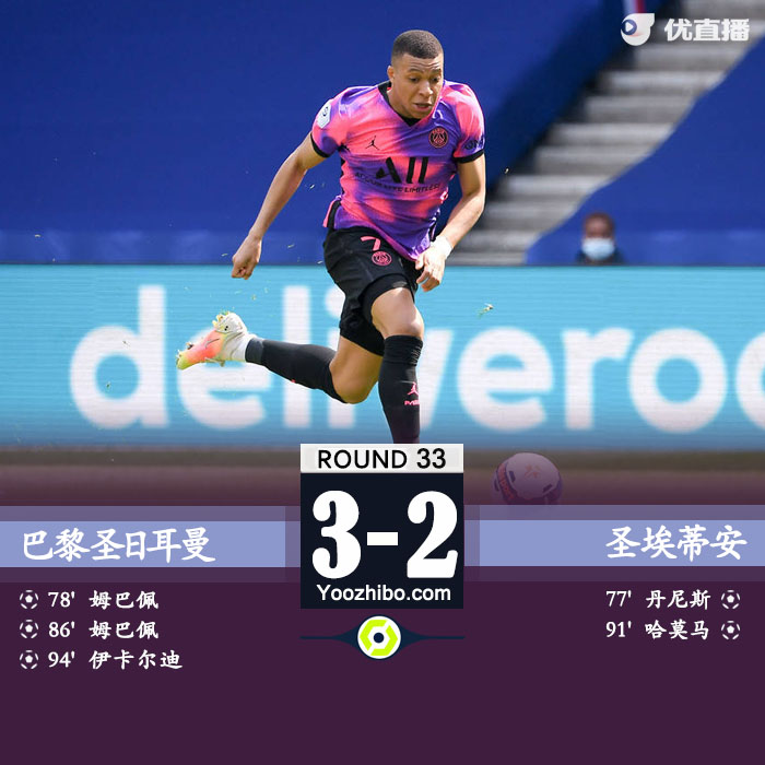 优直播4月18日讯 北京时间4月18日,法甲第33轮巴黎圣日耳曼坐镇主场迎战来访的圣埃蒂安。上半场比赛,圣埃蒂安进球越位在先,姆巴佩失单刀,萨拉维亚任意球中框,半场结束双方互交白卷。下半场比赛丹尼斯为圣埃蒂安率先破门,随后姆巴佩快速扳平,终场前打入一粒点球,全场补时阶段哈莫马扳平,伊卡尔迪绝杀。最终全场战罢,巴黎主场3-2圣埃蒂安,距离榜首里尔1分。