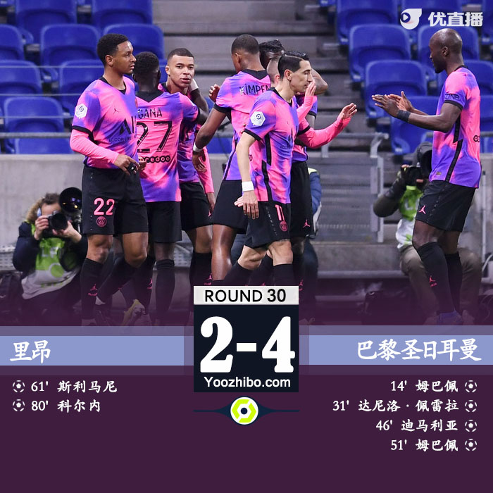 优直播3月22日讯 北京时间03月22日星期一04:00,法甲第30轮里昂主场迎战巴黎圣日耳曼。上半场,姆巴佩首开记录,达尼洛扩大比分。下半场迪马利亚任意球直接破门,姆巴佩完成双响,斯利马尼和科内特破门。最终,巴黎4-2里昂登顶。