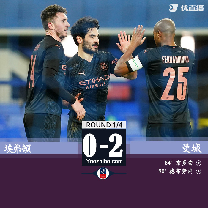 优直播3月21日讯 北京时间3月21日01:30,足总杯1/4决赛,曼城客场挑战埃弗顿。上半场,两队互有攻守,津琴科门线前做出关键解围;下半场,京多安头球补射建功,德布劳内第90分钟劲射破门锁定胜局。最终,曼城2-0击败埃弗顿,进入足总杯四强。